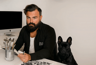 Who am I? Who knows? Some people might call me a Graphic Designer, Art Director, Illustrator, Tattooer, Painter. The possibilities are endless! My work blends commercial clarity with a painter’s eye, shaped by years of design leadership and a lifelong studio practice. Whether it’s packaging, campaigns, or murals, I approach every project with the same curiosity and craft I bring to my canvas. When I step away from the screen, you’ll usually find me sketching, painting, or sniffing Tommy’s paws. (Tommy is my French Bulldog)